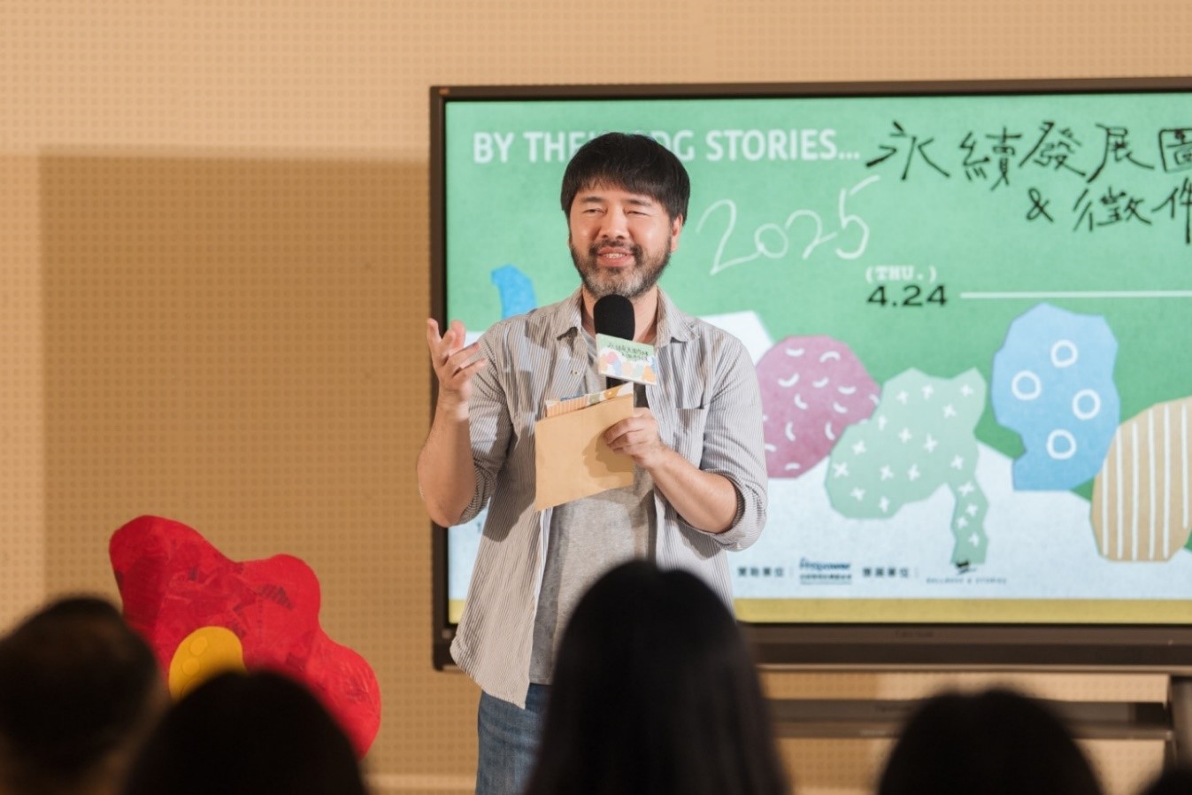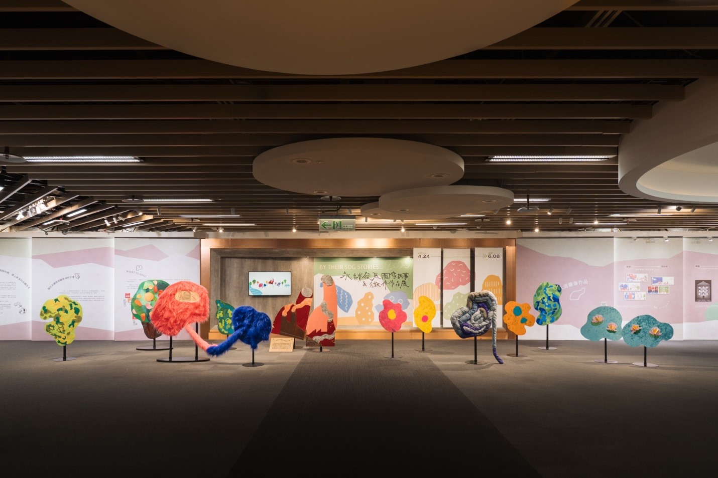 展覽另一大亮點是藝術家姬以得獎作品為靈感,結合SDGs色彩語彙與圖像敘事,創作出14座立體裝置。這些作品運用柔軟布料與日常紙材製成,觀者可穿梭其間,透過觸覺與視覺共同感受永續故事的溫度與深意,如同翻閱一本立體繪本,讓抽象的永續概念轉化為貼近生活的行動想像。
