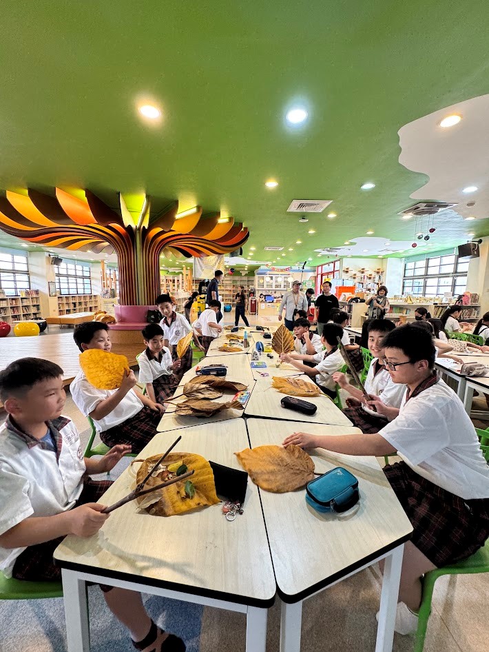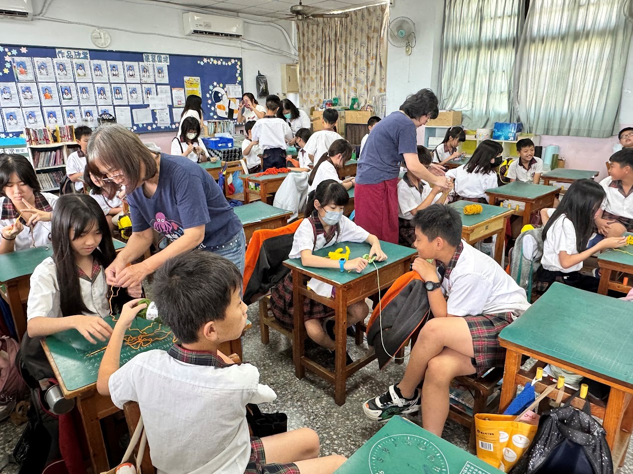 天鈺環境永續基金會(天鈺基金會)與臺中市立圖書館(中市圖)今年透過與國立海洋科技博物館(海科館)的三方合作,於臺中市八所國小以及臺中市立圖書館分館,辦理海洋保育講座與走讀工作坊。世界地球日4/22(二)在臺中市烏日區九德國小,上午由海科館的鄭淑菁老師和織女志工們帶領師生進行海洋生態及珊瑚保育介紹,並用毛線編織珊瑚做裝置藝術。下午由藝術家林宇儂老師帶領師生,透過在校園採集植物素材,結合海科館帶來的海廢玻璃,創作獨一無二的藝術頭冠。